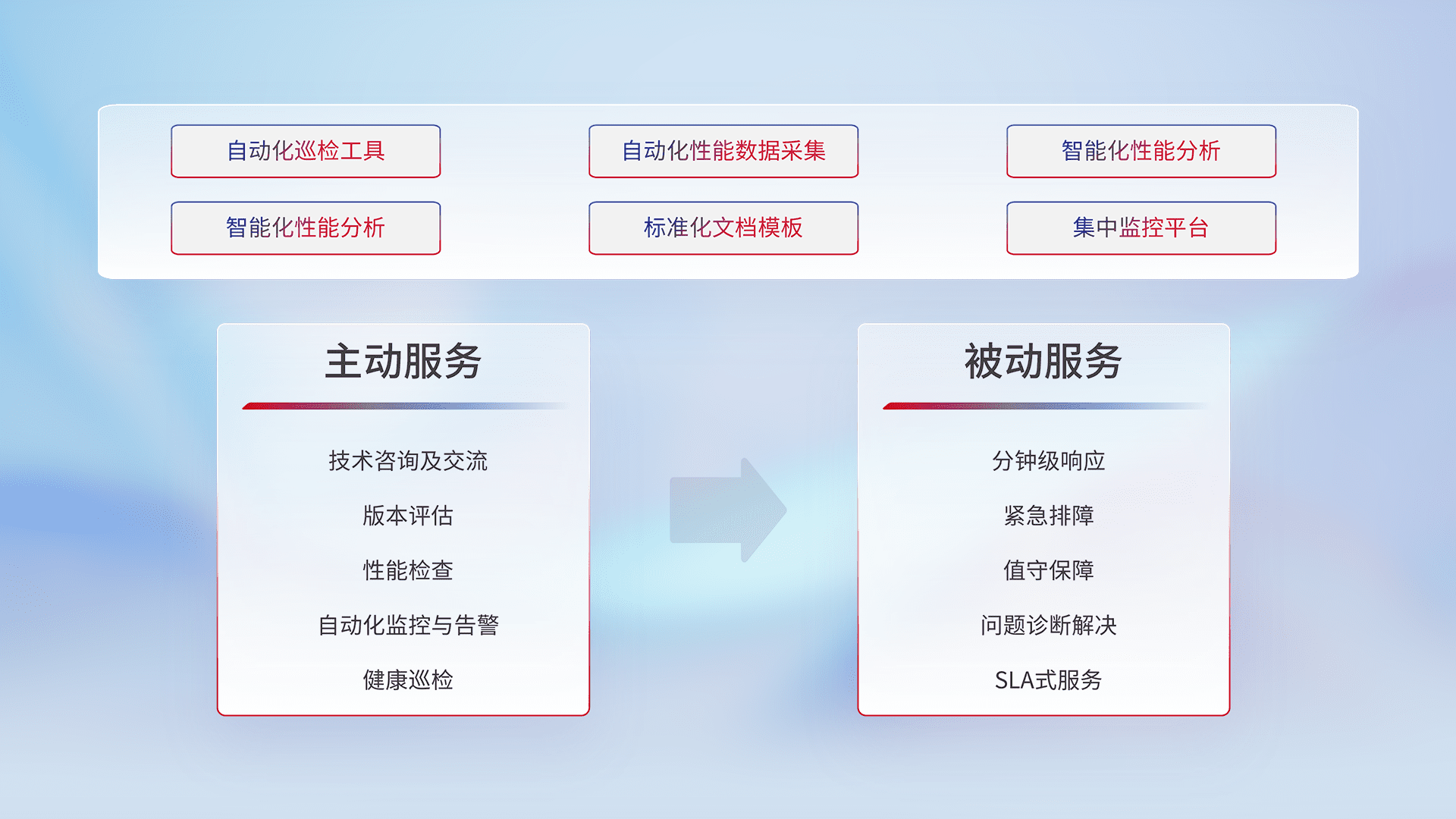 智能化工具和标准化文档,,,保障服务质量,,提供主动服务(包含技术咨询、、版本评估、、性能检查、、自动化监控与告警、、、、健康巡检)和被动服务包含(分钟级响应、、、紧急排障、、值守保障、、问题诊断解决、、、、SLA服务)。。。